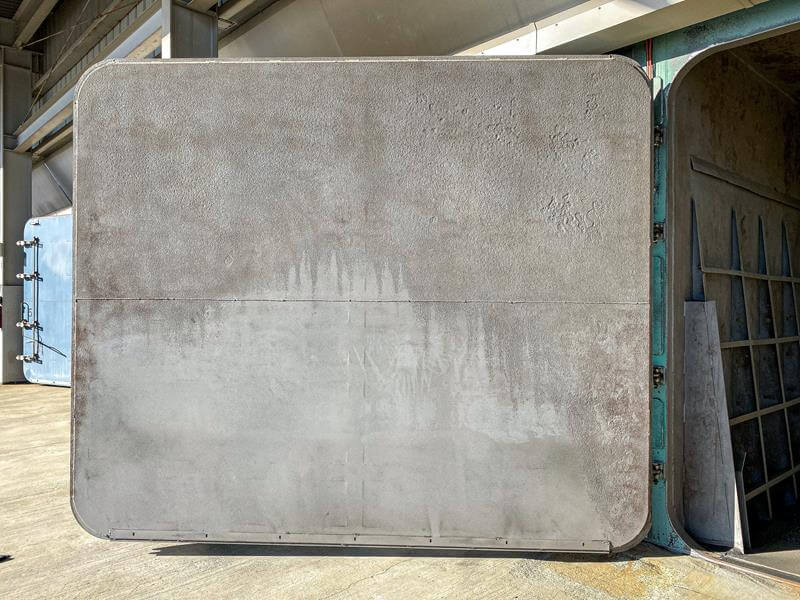 After years of use, the interiors of these tanks were suffering from advanced corrosion. The tanks were emptied, and the screens that line the walls were removed. All of the steel surfaces, including the doors, were then abrasive blasted.