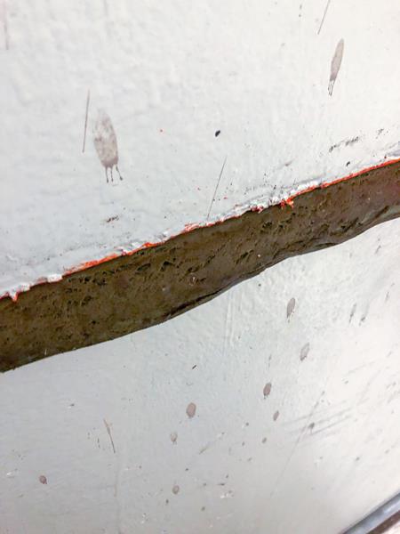 The first step, after following all local and federal confined space safety precautions, was to remove a previously installed joint sealer that had failed. Manual grinders were then used to remove all the existing coating from the walls to provide a clean and rough surface for the ENECRETE WP & WS to anchor and bond to.