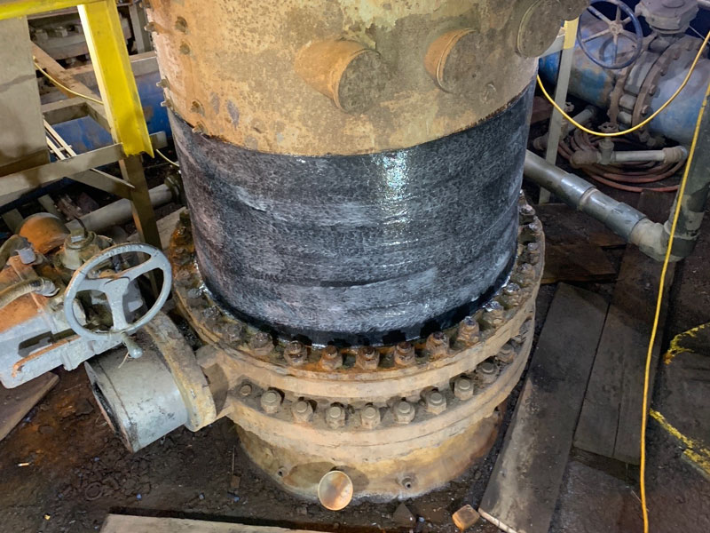 The pipe was grit blasted and repaired by bonding and strapping a metal plate to its severely damaged areas with CeramAlloy CP+AC. The DuraWrap Primer was used to fill any surface imperfections. This process provided a smooth, stable surface to which the carbon fiber wrap could adhere.