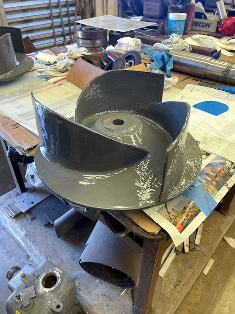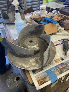 The impeller surface was abrasive blasted to a 3 mil profile. To rebuild the impeller vanes, expanded metal was cut & formed on the deteriorated leading edges of each vane, then faired with DurAlloy, allowed to cure, and sanded back to the manufacturer's dimensions. This was followed by two coats of CeramAlloy CL+AC, one gray, then one blue.