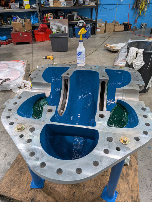 The pump’s internal surfaces were properly prepared by abrasive blasting to a white metal finish with a 5–7 mil profile, then protected with two coats of CeramAlloy CL+AC, providing a durable, corrosion- resistant barrier.
